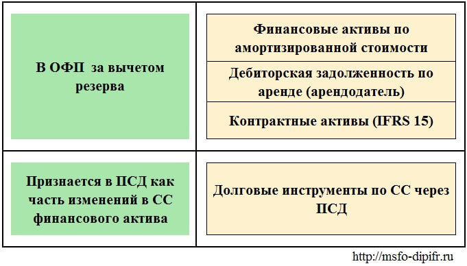 Финансовые активы, учитываемые по справедливой стоимости через прибыли и убытки, не нуждаются в начислении резерва на обесценение, поскольку любое обесценение сразу же отражается в их стоимости. Резерв на сумму ожидаемых кредитных убытков создается для: