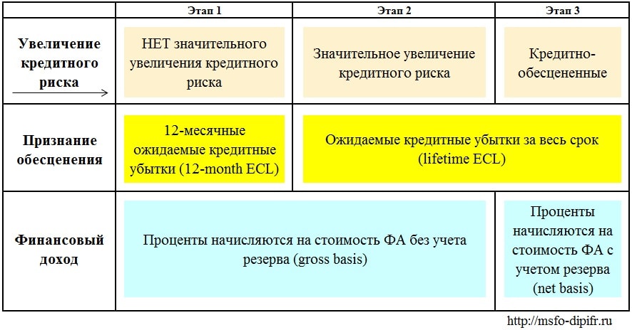 В таблице 1 показаны три стадии увеличения кредитного риска (=ухудшения качества) финансового актива, по которому в конечном счете произойдёт дефолт. В стандарте нет разделения на 1-ю, 2-ю и 3-ю стадии (этапы), такое разделение используется в учебниках и комментариях к стандарту для наглядности и облегчения запоминания.