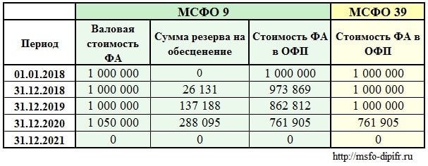 В отчете о финансовом положении стоимость финансового актива по МСФО 39 равна амортизированной стоимости. По МСФО 9 актив отражается за вычетом резерва по обесценению, т.е. стоимость актива по МСФО 9 в ОФП меньше стоимости, которая отражалась бы в данных условиях по старому стандарту МСФО 39.
