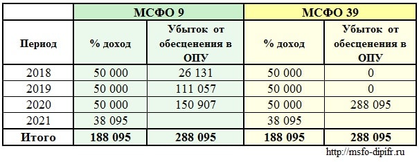 Как видно из сравнительной таблицы ниже в данной задаче признанный Альфой финансовый доход и общая сумма убытка от обесценения получились одинаковыми вне зависимости от модели обесценения. При этом признание убытка от обесценения по МСФО 9 растянуто на три года, тогда как по МСФО 39 весь убыток признавался бы только после того, как произошел дефолт по выплате процентов в 2020 году.