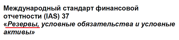 Хотелось бы разъяснить эту терминологическую путаницу и расставить все точки над Ё. Оценочные обязательства в балансе — это не оценочные резервы и тем более не резервный капитал. Это особый тип обязательств, учет которых регулируется в МСФО 37 «Provisions, liabilities and contingent assets», что я бы перевела как «Оценочные обязательства, условные обязательства и условные активы» — точно так, как называется российский ПБУ 8/2010, посвященный этой теме.