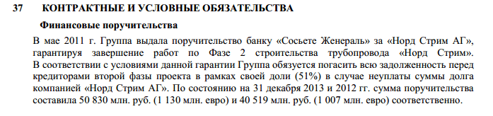 В данном случае есть прошлое событие, но будет ли отток экономических выгод зависит от того, случится или нет какое-то будущее событие. То есть обязательство материализуется при условии того, что в будущем что-то случится. Такие условные обязательства раскрываются в пояснительной записке к отчетности, если только вероятность оттока ресурсов не является крайне малой (remote). В качестве примера таких условных обязательств можно привести обязательства по финансовым гарантиям. Ниже приведена выдержка из отчетности МСФО за 2013 год компании Газпром.