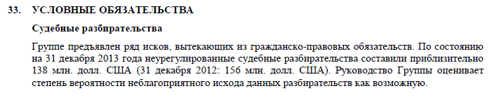 А такая ситуация является обычной. Когда менеджмент компании анализирует наличие обязательств на отчетную дату, понятное дело, что не все из них будут удовлетворять критериям признания оценочного обязательства. Если произошло событие, которое указывает на наличие обязательства, но остальные два критерия не выполнены, то такое существующее обязательство только раскрывается в пояснительной записке. В качестве примера можно привести судебные разбирательства. В каких-то случаях, проигрыш в суде будет высоковероятен, но не всегда. К счастью, бывает и обратная ситуация, когда исковые претензии противной стороны оказываются тщетными. Ниже приведена краткая выдержка из отчетности МСФО за 2013 год компании Норильский никель.