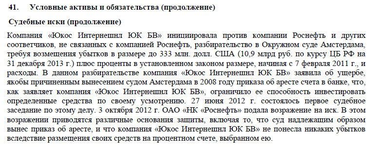 Очень интересно почитать историю судебного противостояния компании Роснефть и бывших акционеров Юкоса, которая изложена в пояснительной записке к отчетности по международным стандартам. Здесь я привожу только краткую выдержку из обширного описания ситуации в примечаниях к отчетности 2013 года.